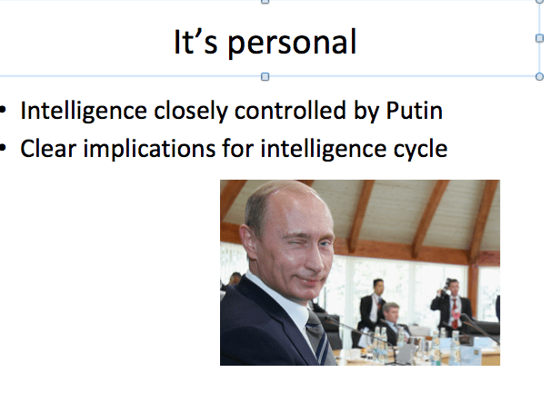 Indeed, one recent analysis of Russian intelligence argued that ‘the highly personalized systems for evaluating intelligence and transmitting it to the President damage its quality and impact on policy’. – Mark Galeotti, Putin’s Hydra: Inside Russia’s Intelligence Services.